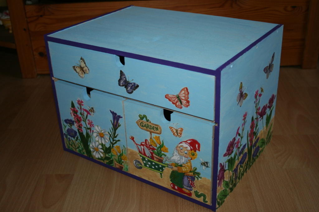 Schubladenschränkchen, Schränkchen bzw. Minikommode, Kinder Kommode mit Design Gartenzwerg, Blumen sowie Schmetterlinge.