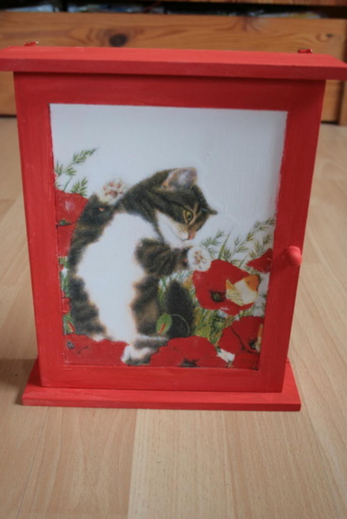 Das Schlüsselschränkchen, Schlüsselkästchen bzw. die Dekoration wurde mittels schwarz weißer Katze in Mohnblumen gestaltet