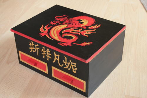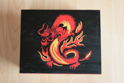 meine letzte Auftragsarbeit, die mir schon aufgrund des Motivs riesigen Spass gemacht hat - ein Schmuckkästchen mit Drachenmotiv!